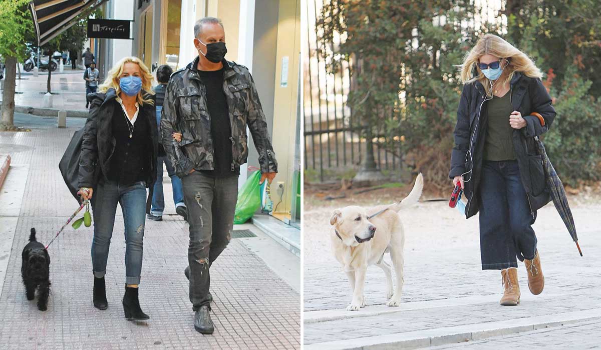 Φορώντας τις μάσκες τους, η παρουσιάστρια του «Still standing» και ο σύζυγός της στάθηκαν για λίγο μόλις είδαν τον φωτογράφο και μετά το «κλικ» συνέχισαν τον περίπατό τους.