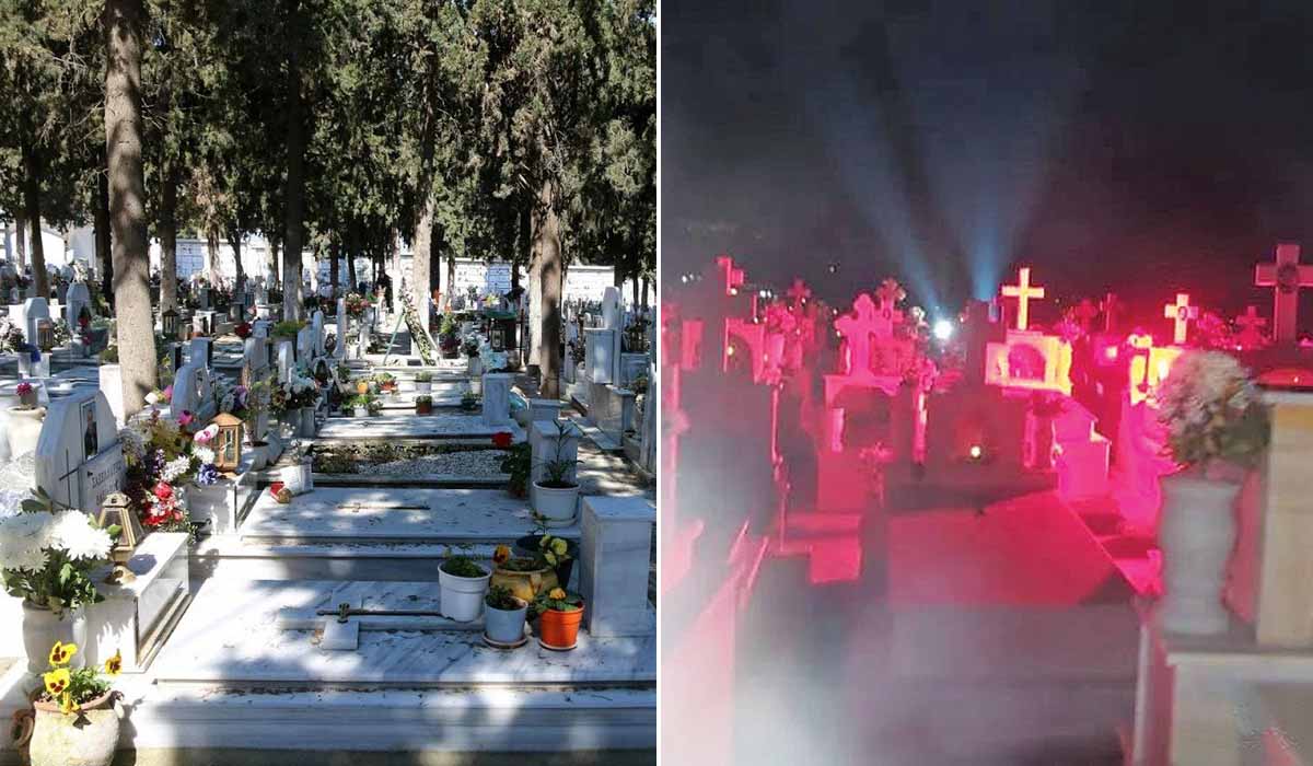 Το απίστευτο περιστατικό συνέβη το βράδυ της Κυριακής στην περιοχή Πηγάδια, όπου βρίσκεται το κοιμητήριο, όταν οι βέβηλοι τοποθέτησαν πίσω από τους τάφους ηχεία και φωτισμό που χρησιμοποιείται σε νυχτερινά κέντρα διασκέδασης!