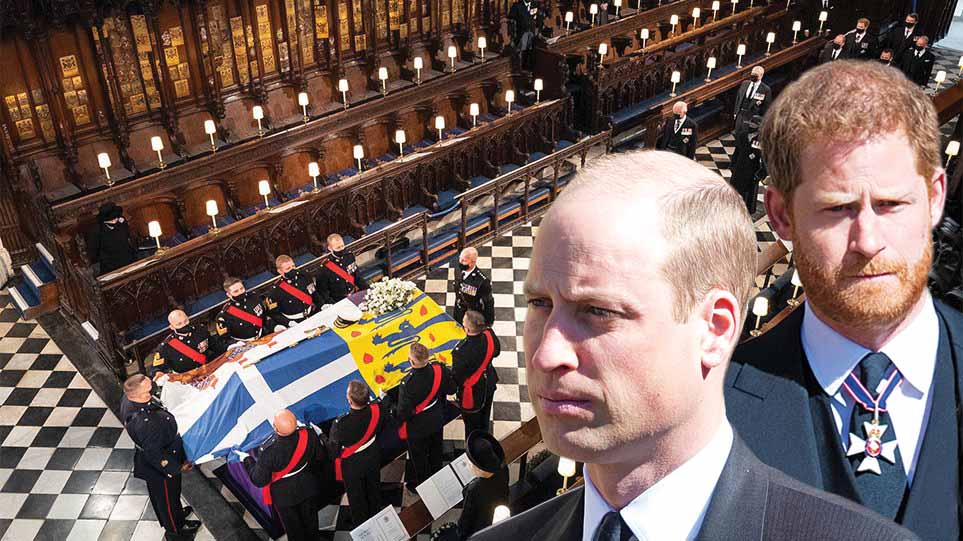 Τα μάτια όλου του κόσμου όμως ήταν στραμμένα πάνω στον Χάρι και στον Ουίλιαμ, οι οποίοι συναντήθηκαν για πρώτη φορά έπειτα από έναν χρόνο και αφότου ο Χάρι είχε αποκαλύψει στην πολυσυζητημένη συνέντευξή του στην Οπρα ότι οι σχέσεις τους είναι τεταμένες. Σύμφωνα με πληροφορίες, ο πρίγκιπας Ουίλιαμ είχε ζητήσει από τον ξάδερφό τους, γιο της πριγκίπισσας Αννας, Πίτερ Φίλιπς να περπατήσει ανάμεσά τους στην πομπή πίσω από το φέρετρο, επιβεβαιώνοντας την ψυχρότητα που ένιωθε προς τον αδερφό του.
