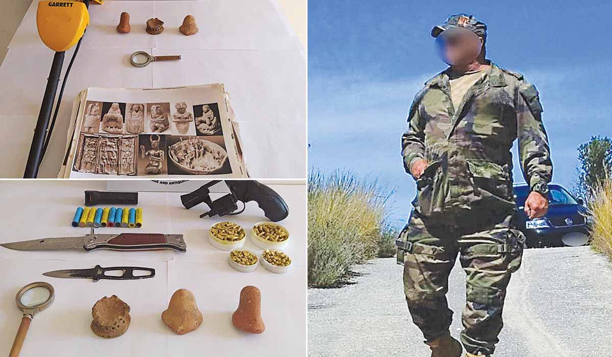 Κατά τη διάρκεια της προκαταρκτικής έρευνας, σε συνεργασία με τους αστυνομικούς του Τμήματος Αρεόπολης διαπιστώθηκε ότι ο 59χρονος έκανε κατ’ εξακολούθηση παράνομες έρευνες, με ανιχνευτή μετάλλων, σε απόμερες περιοχές και έβαζε στο χέρι αρχαιότητες διάφορων ειδών και από διαφορετικές εποχές, τις οποίες δεν δήλωνε στις αρμόδιες Αρχές. Μάλιστα, όπως έγινε γνωστό, κατά τη διάρκεια της σύλληψής του ο 59χρονος είχε πάντα στο κάθισμα του συνοδηγού του αυτοκινήτου του ένα περίστροφο γεμάτο με σφαίρες.