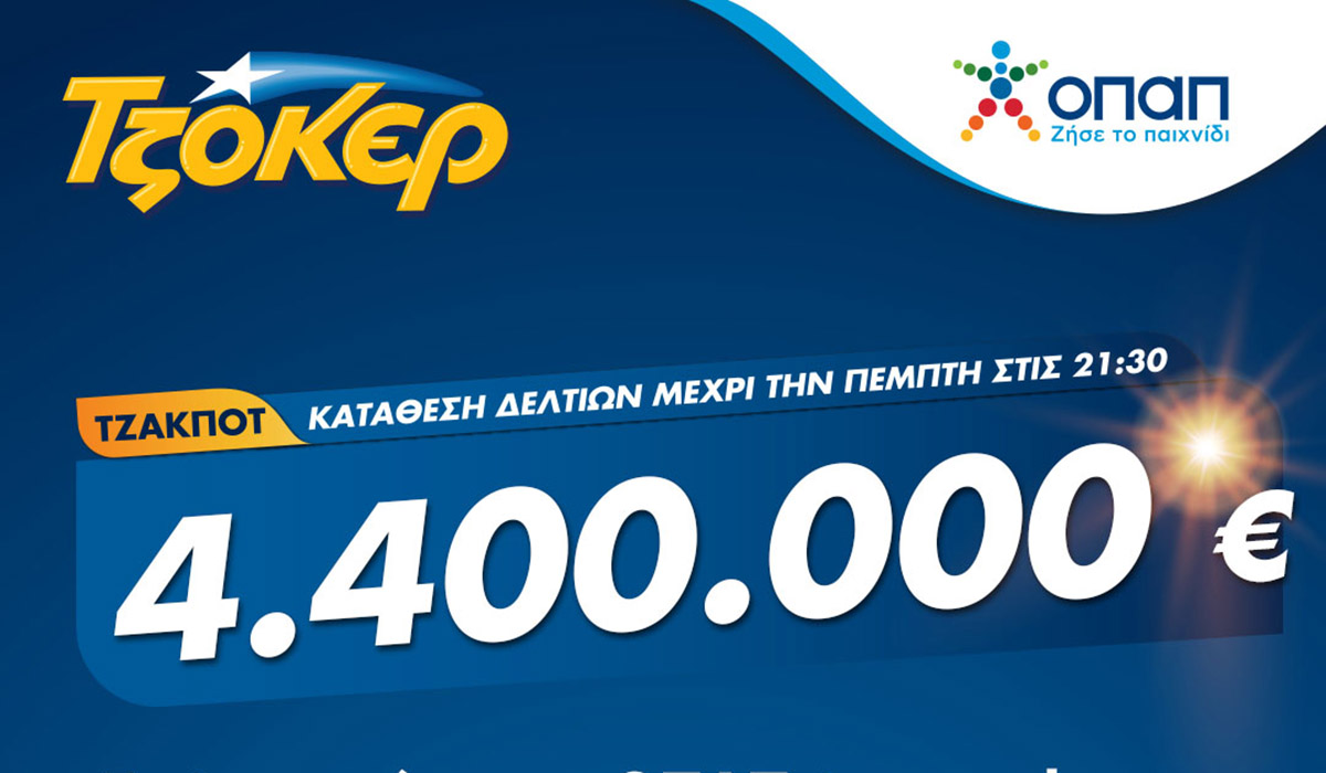 Ξεπέρασε το φράγμα των 4 εκατομμυρίων ευρώ το ΤΖΟΚΕΡ και απόψε μοιράζει στους νικητές της πρώτης κατηγορίας τουλάχιστον 4,4 εκατομμύρια ευρώ. Το ποσό αυτό θα κερδίσουν όσοι καταφέρουν να μαντέψουν σωστά τους 5 αριθμούς που θα κληρωθούν στο πρώτο πεδίο των 45 αριθμών και τον ένα αριθμό ΤΖΟΚΕΡ από το δεύτερο πεδίο των 20 αριθμών του παιχνιδιού.