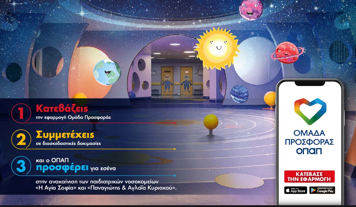 Στην τελική ευθεία μπαίνει ο εφετινός αγώνας της «Ομάδας Προσφοράς ΟΠΑΠ» για την ανακαίνιση των παιδιατρικών νοσοκομείων. Έως την ερχόμενη Κυριακή 14 Νοεμβρίου, με κάθε νέο download της εφαρμογής «Ομάδα Προσφοράς» ο ΟΠΑΠ αυξάνει το ποσό που θα προσφέρει στο έργο της ανακαίνισης των νοσοκομείων «Η Αγία Σοφία» και «Παναγιώτης και Αγλαΐα Κυριακού». Η συνεισφορά του ΟΠΑΠ γίνεται ακόμη μεγαλύτερη όσο περισσότερο συμμετέχουμε στις δοκιμασίες του app και συγκεντρώνουμε πόντους.