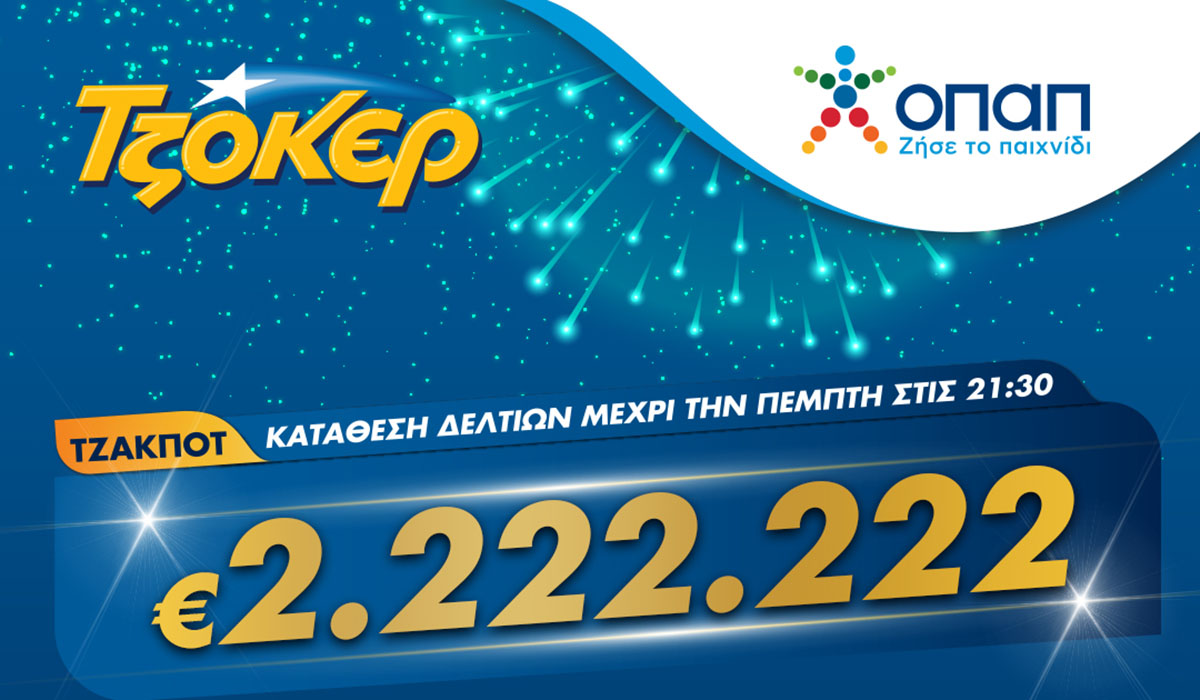 Γεμάτο δυάρια είναι το μεγάλο έπαθλο που μοιράζει απόψε το ΤΖΟΚΕΡ, το οποίο ανέρχεται σε 2.222.222 ευρώ. Tο ποσό αυτό, το οποίο έχει συγκεντρωθεί ύστερα από επτά συνεχόμενα τζακ ποτ σε ισάριθμες κληρώσεις, θα μοιραστούν οι νικητές της πρώτης κατηγορίας.