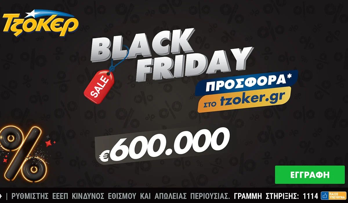 Σε ρυθμό Black Friday βρίσκεται το ΤΖΟΚΕΡ online, εν όψει της κλήρωσης της Κυριακής που μοιράζει 600.000 ευρώ. Οι παίκτες που συμπληρώνουν διαδικτυακά το δελτίο τους μπορούν να βρουν μια μεγάλη προσφορά, για την οποία θα μάθουν περισσότερα κάνοντας εγγραφή στο tzoker.gr ή σύνδεση στον λογαριασμό τους. Για την προσφορά Black Friday ισχύουν όροι και προϋποθέσεις.