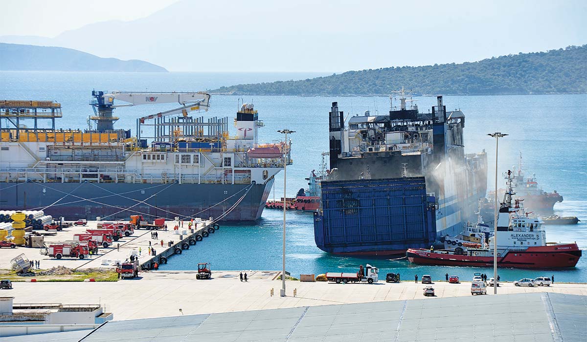 Οι έρευνες στο εσωτερικό του πλοίου συνεχίζονται με αργούς ρυθμούς λόγω του υψηλού θερμικού φορτίου και των τοξικών αερίων που αναδίδονται. Το άνοιγμα του καταπέλτη θα γίνει όταν πέσουν οι τιμές του μονοξειδίου του άνθρακα και δεν θα υπάρχει κίνδυνος για νέα αναζωπύρωση της φωτιάς.