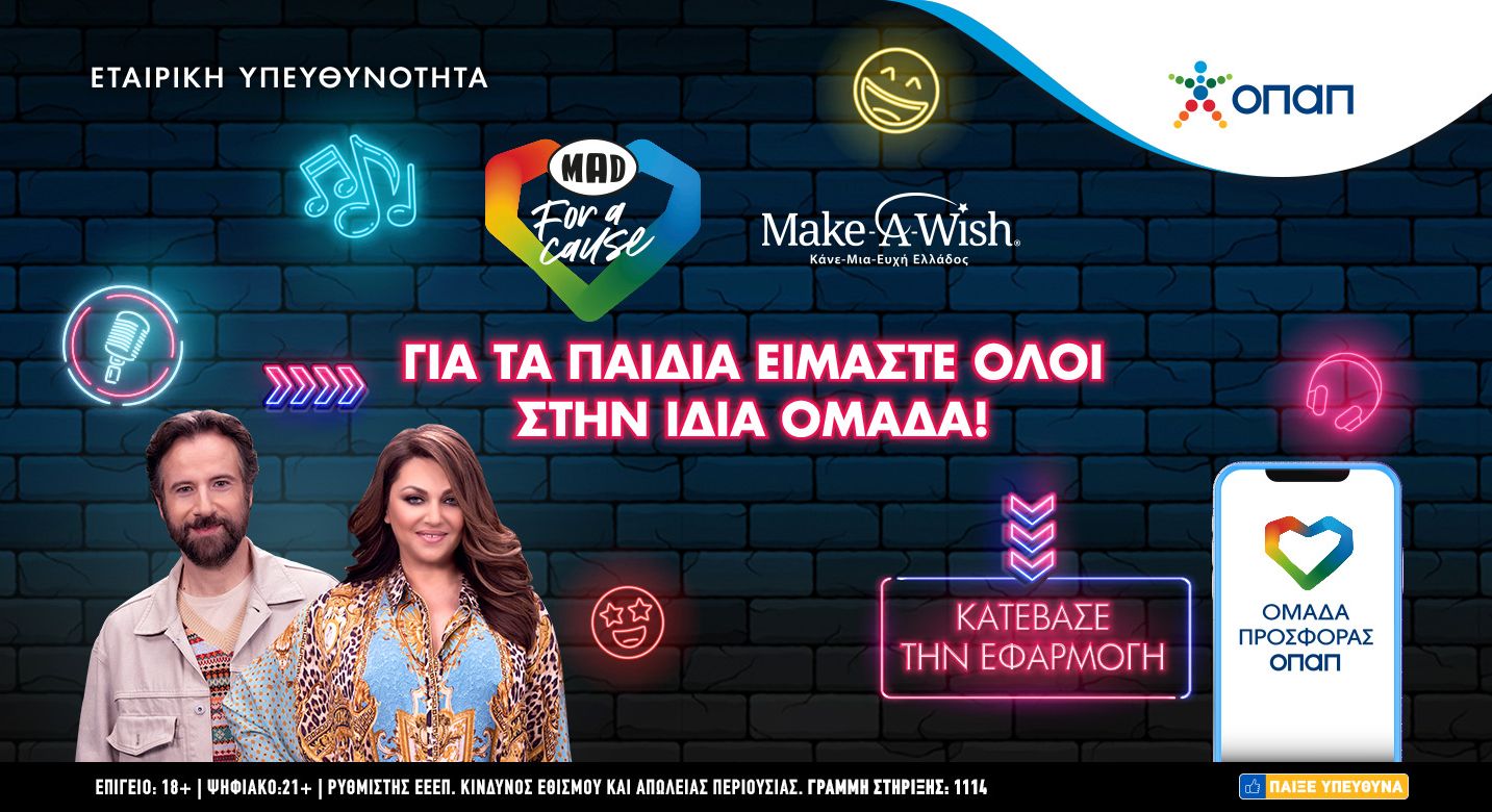 Με ένα δωρεάν download της εφαρμογής «Ομάδα Προσφοράς ΟΠΑΠ» ενισχύουμε την πρωτοβουλία “MAD for a Cause” και κάνουμε πραγματικότητα τις ευχές τεσσάρων παιδιών του Make-A-Wish (Κάνε-Μια-Ευχή Ελλάδος), που πάσχουν από σοβαρά νοσήματα. Παράλληλα, διεκδικούμε δύο δώρα εμπειρίας από την Καίτη Γαρμπή και τον Κωστή Μαραβέγια, οι οποίοι υποστηρίζουν αυτή την σημαντική πρωτοβουλία του ΟΠΑΠ για τα παιδιά.