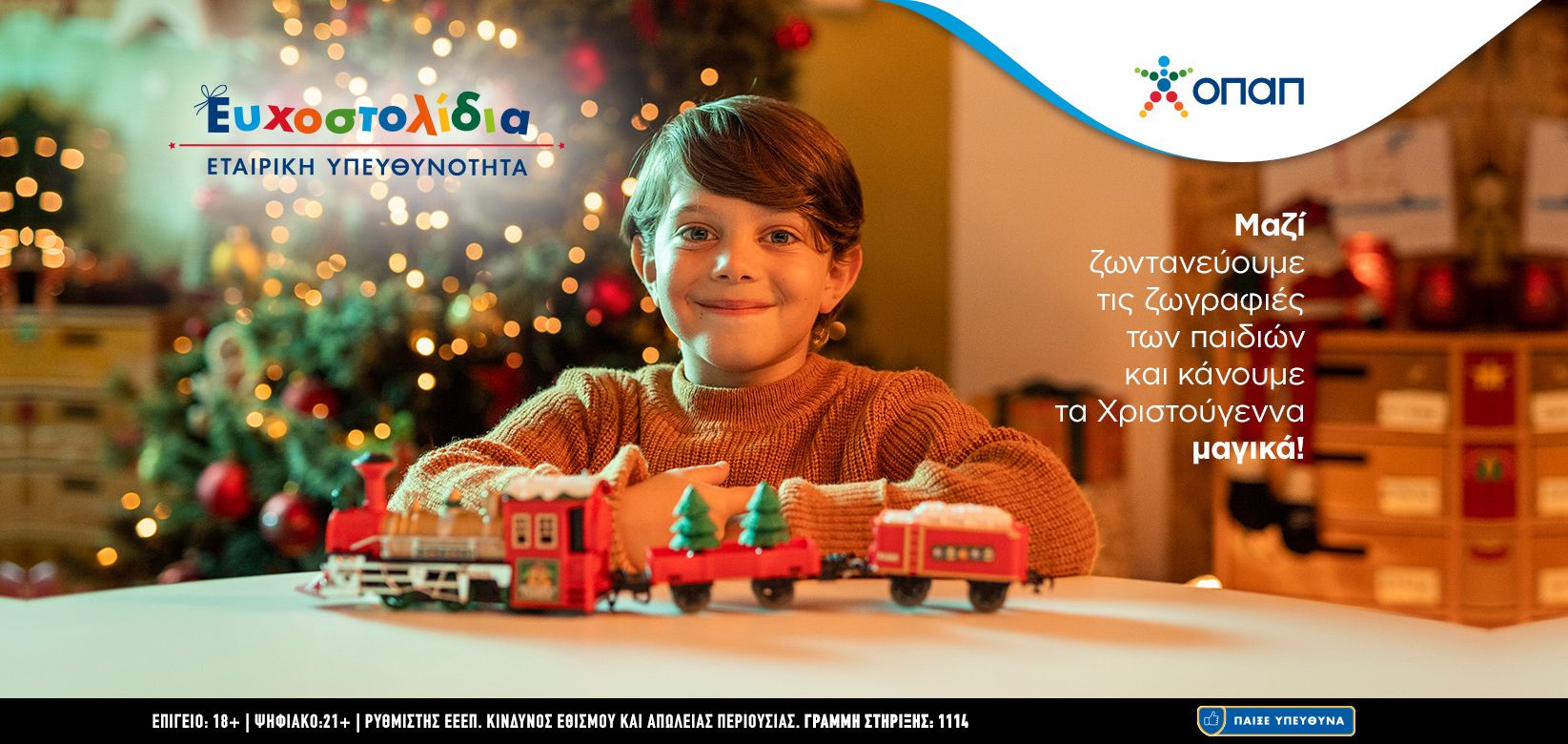 Χιλιάδες παιδιά που έχουν πραγματική ανάγκη θα δουν, για ένατη χρονιά, τις χριστουγεννιάτικες ευχές τους να πραγματοποιούνται μέσα από την πρωτοβουλία Ευχοστολίδια, που υλοποιεί ο ΟΠΑΠ. Παραμένοντας ενεργά δίπλα στην ελληνική κοινωνία και στη νέα γενιά, ο ΟΠΑΠ μας καλεί όλους να συμμετάσχουμε κι εφέτος τα Χριστούγεννα σε αυτή τη μεγάλη γιορτή προσφοράς και αγάπης, με στόχο να εκπληρωθούν οι ευχές χιλιάδων παιδιών από τον Οργανισμό «Το Χαμόγελο του Παιδιού» και την Ένωση «Μαζί για το Παιδί».