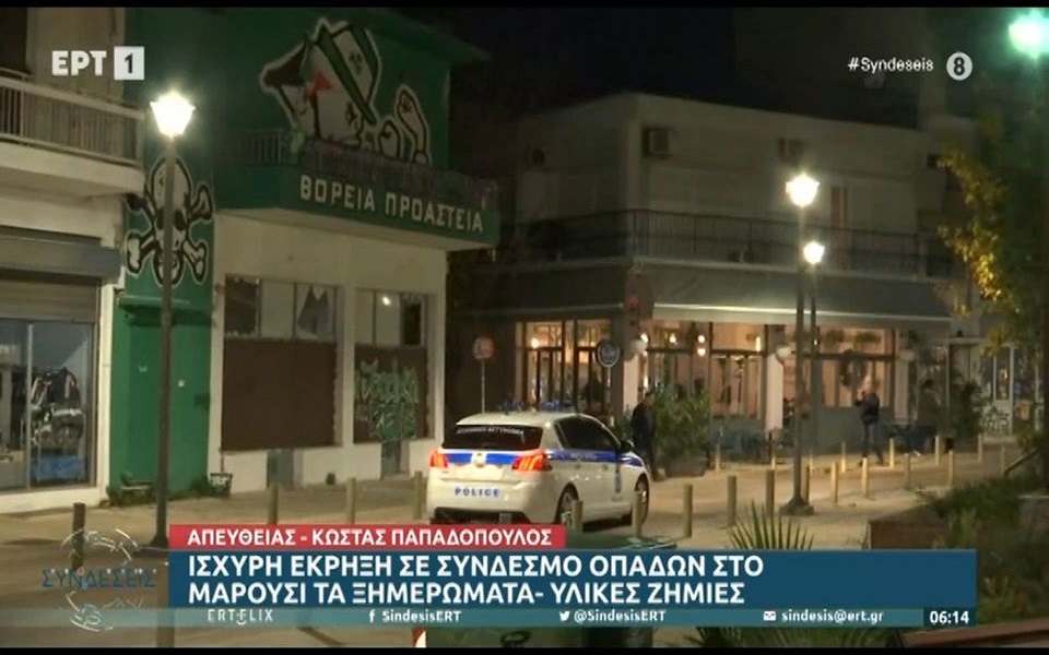 Στο κέντρο του Αμαρουσίου βρίσκεται ο Σύνδεσμος φιλάθλων του Παναθηναϊκού όπου άγνωστοι έβαλαν εκρηκτικό μηχανισμό. Σε μια περιοχή που είναι πυκνοκατοικημένη, σε γειτονικό δρόμο ο κρότος της έκρηξης τρομοκράτησε τους κατοίκους.