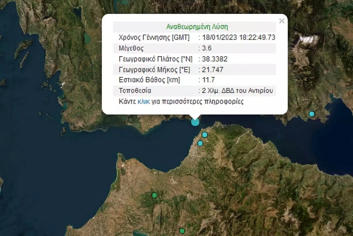 Σεισμός μεγέθους 3,6 βαθμών της κλίμακας Ρίχτερ σημειώθηκε στις 20:22, τρία χιλιόμετρα δυτικά του Αντιρρίου, σύμφωνα με το Γεωδυναμικό Ινστιτούτο Αθηνών.