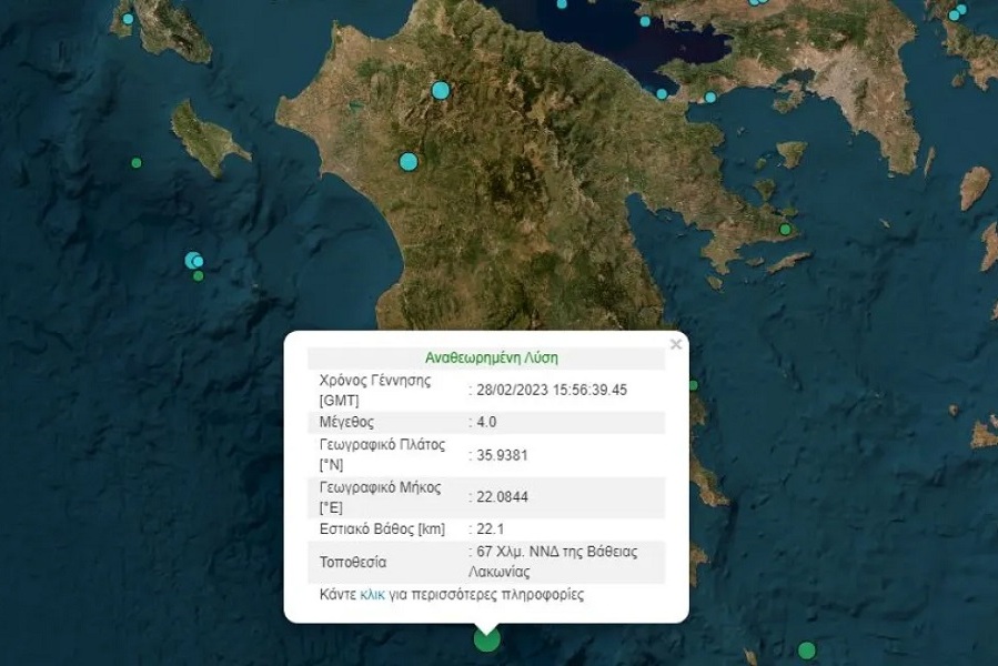 Σύμφωνα με το Γεωδυναμικό Ινστιτούτο, η σεισμική δόνηση έλαβε χώρα στις 17:56 στα 67 χιλιόμετρα νότια νοτιοδυτικά της περιοχής Βάθεια.