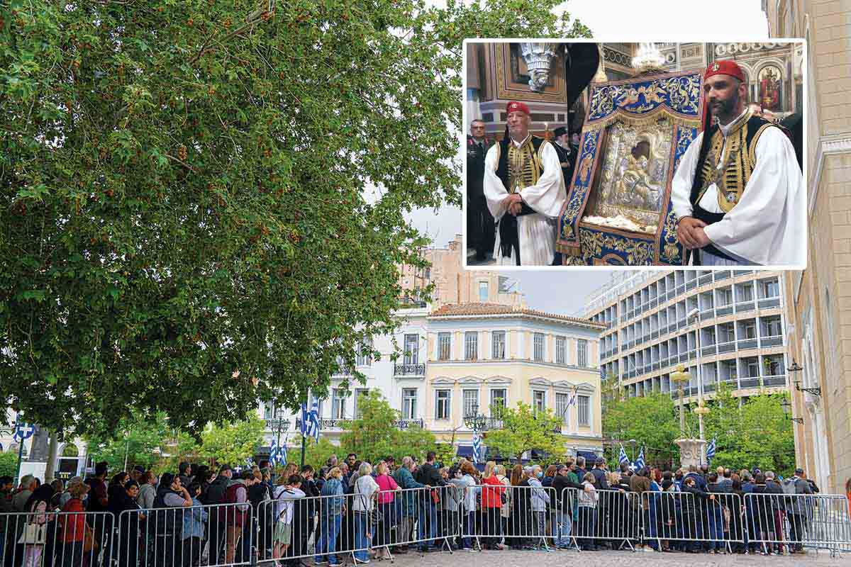 Τεράστιες ουρές σχηματίζουν από τα ξημερώματα της Πέμπτης οι πιστοί έξω από τη Μητρόπολη Αθηνών, προκειμένου να προσκυνήσουν τη θαυματουργή ιερή εικόνα της Παναγίας «Αξιον Εστί», η οποία έφτασε προχθές από το Ιερό Σύνθρονο του Ναού του Πρωτάτου, στις Καρυές του Αγίου Ορους.