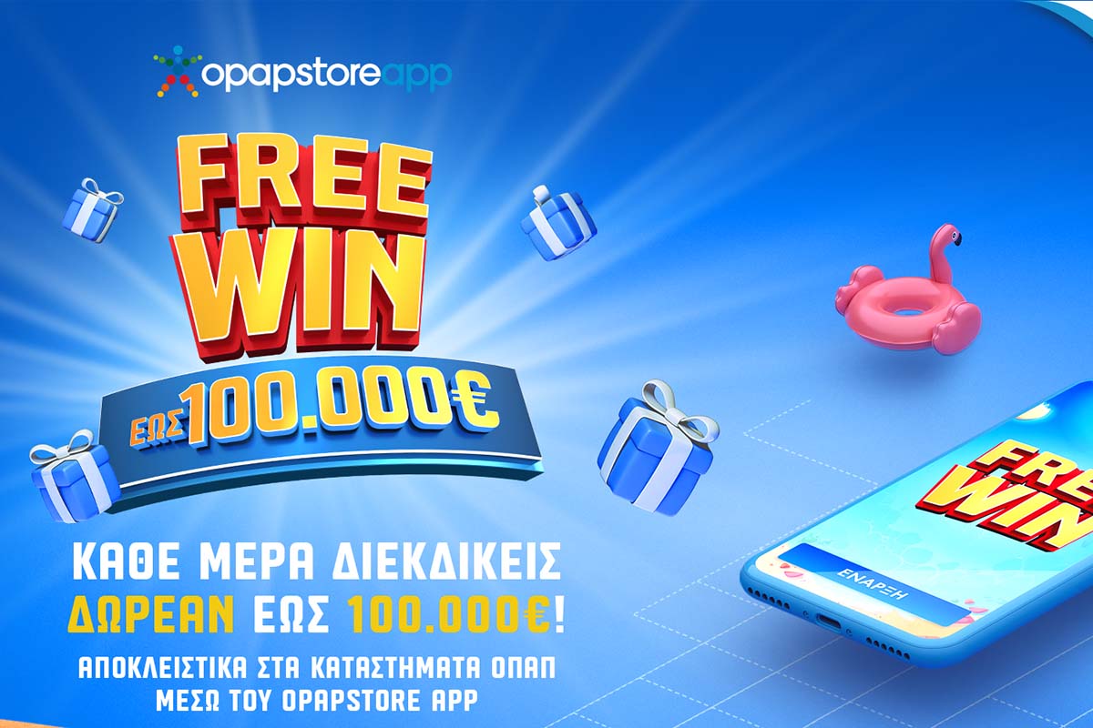 Διασκεδαστικό, καθημερινό και δωρεάν. Τι είναι; Το νέο FREEWIN* από τον ΟΠΑΠ. Μέσα από το OPAP Store App μπαίνεις κι εσύ στον μοναδικό κόσμο του FREEWIN και οι καθημερινές σου αποφάσεις μπορούν να σε οδηγήσουν σε μεγάλα κέρδη. Το FREEWIN ξεκινάει κάθε ημέρα μόνο στα καταστήματα ΟΠΑΠ και με κάθε σωστή επιλογή έρχεσαι όλο και πιο κοντά στα 100.000 ευρώ.