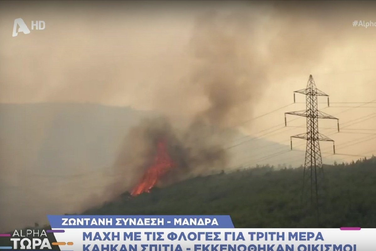 Αγωνία για τη Μάνδρα Αττικής. Η μάχη με τις φλόγες συνεχίζονται για τρίτη ημέρα. Κάηκαν σπίτια και εκκενώθηκαν οικισμοί.