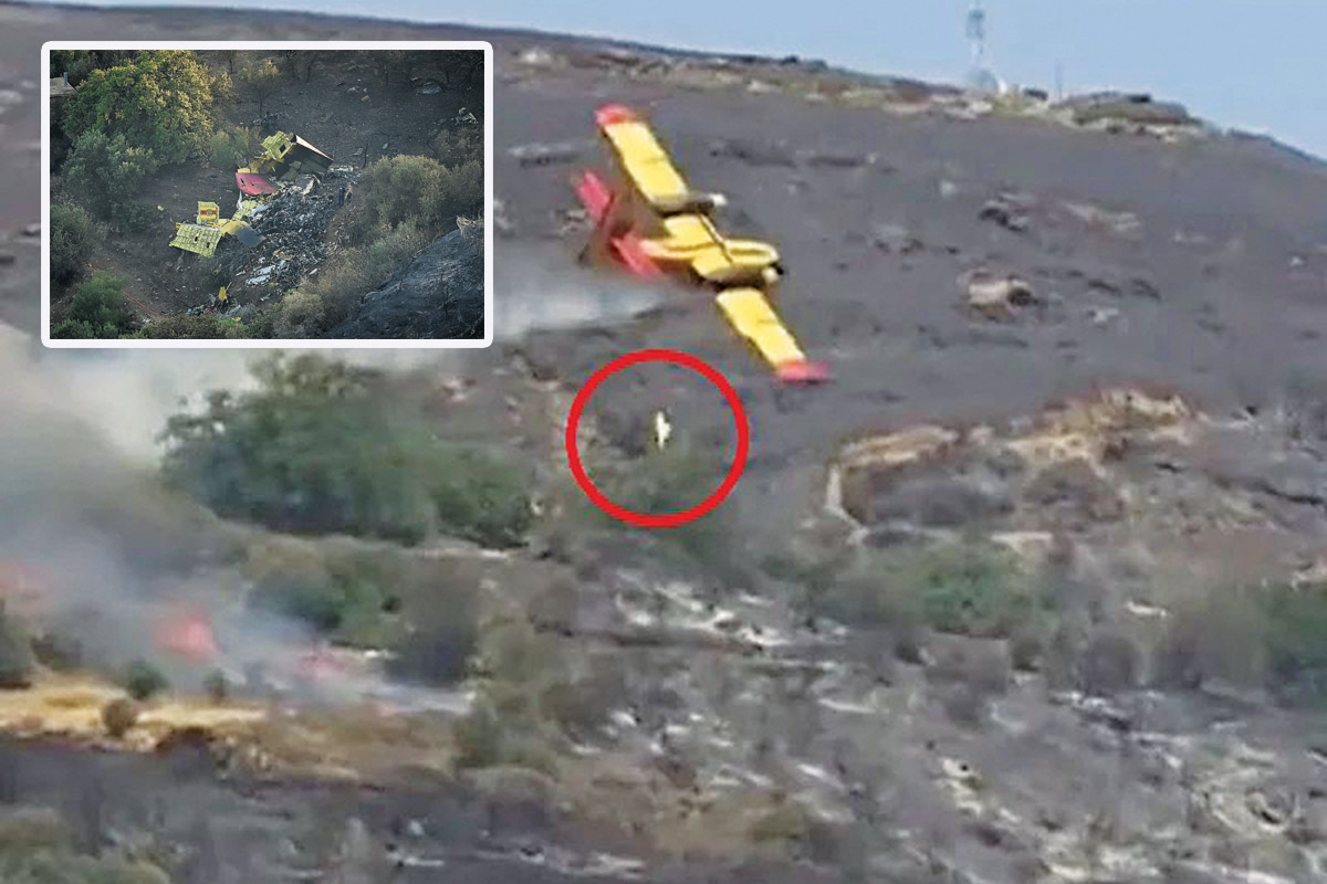 Το φτερό του Canadair μόλις έχει βρει στο δέντρο πριν από την πτώση. Ένθετη: Συντρίμμια στο σημείο της πτώσης