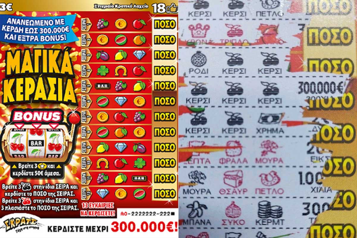 Όσον αφορά στον τυχερό λαχνό του ΣΚΡΑΤΣ «ΜΑΓΙΚΑ ΚΕΡΑΣΙΑ», που κόστισε μόλις 3 ευρώ, ο κ. Καλουτάς αναφέρει: «Ο μεγάλος νικητής βρήκε τα τρία μαύρα κεράσια πάνω στον τυχερό λαχνό και δίπλα το ποσό των 300.000 ευρώ».