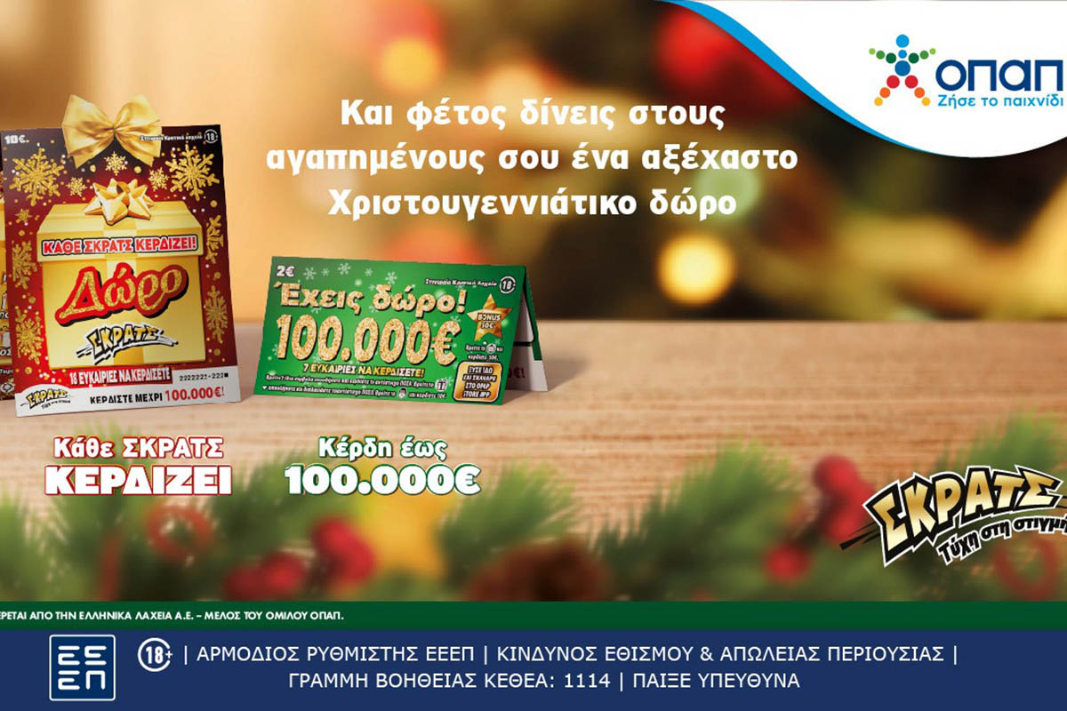 Στον ρυθμό των Χριστουγέννων κινείται το ΣΚΡΑΤΣ, με τους λαχνούς «Δώρο ΣΚΡΑΤΣ» και «Έχεις Δώρο 100.000 ευρώ». Όπως κάθε χρόνο έτσι και εφέτος, τα δημοφιλή παιχνίδια ΣΚΡΑΤΣ ανεβάζουν τη γιορτινή διάθεση, προσφέροντας παράλληλα ευκαιρίες για κέρδη.