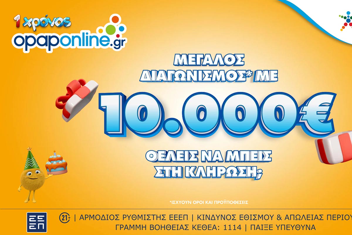 Μέχρι την Κυριακή, 14 Απριλίου, όλοι όσοι επισκέπτονται το opaponline.gr και το Opaponline App έχουν τη δυνατότητα να συμμετάσχουν δωρεάν στην κλήρωση που θα αναδείξει τον μεγάλο τυχερό των 10.000 ευρώ*.