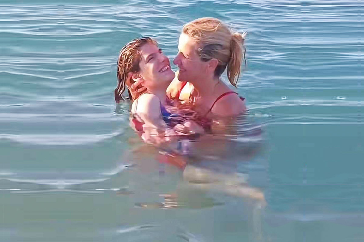 H κυρία Μαρία Πατελάρου κρατώντας αγκαλία στη θάλασσα την κόρη της Ραφαέλα