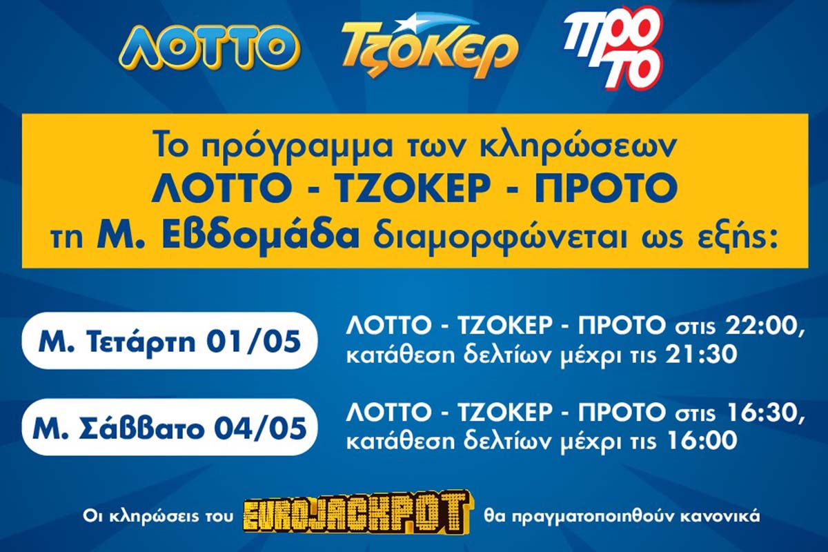 Οι κληρώσεις των ΤΖΟΚΕΡ και ΠΡΟΤΟ θα επανέλθουν στο κανονικό τους πρόγραμμα από την Τρίτη, 7 Μαΐου.