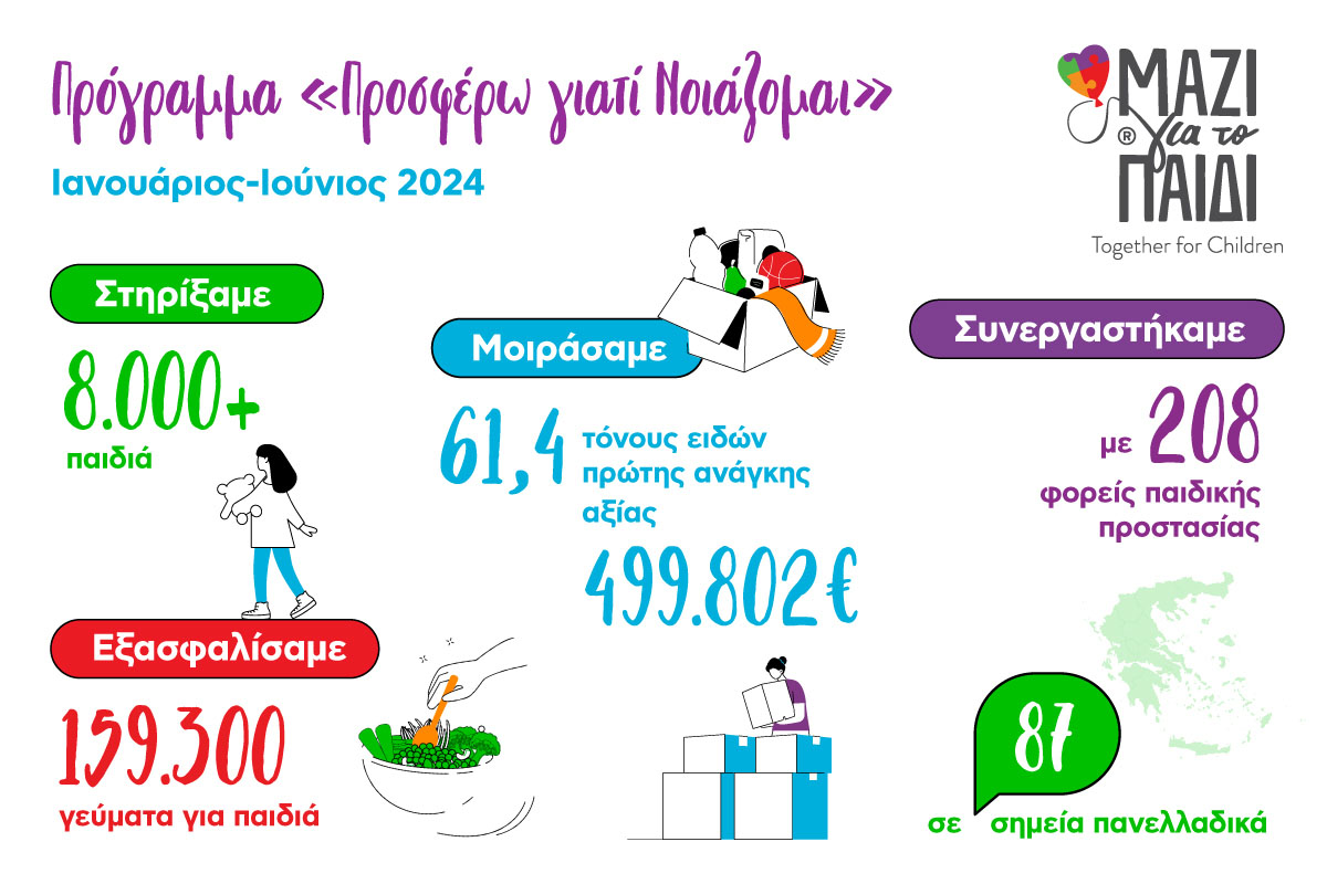 Το Μαζί για το Παιδί, μέσω του προγράμματος «Προσφέρω γιατί Νοιάζομαι», στήριξε 7.173 παιδιά που φιλοξενούνται σε φορείς παιδικής προστασίας σε όλη την Ελλάδα κατά το πρώτο εξάμηνο του 2024. Η κοινωνική υπηρεσία του «Μαζί για το Παιδί» ανταποκρίθηκε σε αιτήματα από 208 φορείς παιδικής προστασίας και κοινωνικά παντοπωλεία δήμων σε 87 διαφορετικά σημεία της χώρας, προσφέροντας 61,4 τόνους ειδών πρώτης ανάγκης συνολικής αξίας 499.802 ευρώ.