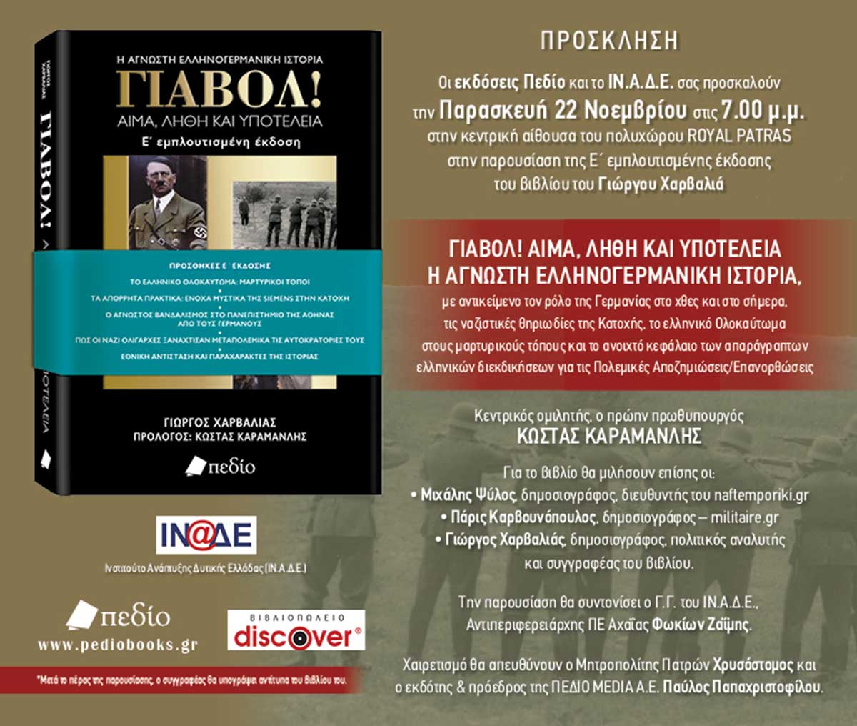 Την Παρασκευή 22 Νοεμβρίου, ώρα 19:00, οι Εκδόσεις Πεδίο και το ΙΝ.Α.Δ.Ε. σας προσκαλούν στην κεντρική αίθουσα του πολυχώρου ROYAL PATRAS στην παρουσίαση της ε΄ εμπλουτισμένης έκδοσης του βιβλίου του Γιώργου Χαρβαλιά Γιαβόλ! Αίμα, λήθη και υποτέλεια. Κεντρικός ομιλητής, ο πρώην πρωθυπουργός Κώστας Καραμανλής.