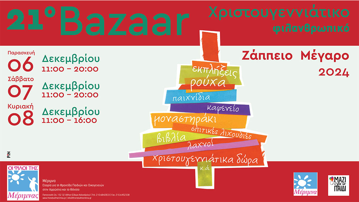 Σας περιμένουμε στο 21ο Χριστουγεννιάτικο Bazaar μας των Φίλων της Μέριμνας από 6 έως 8 Δεκεμβρίου στο Ζάππειο Μέγαρο.