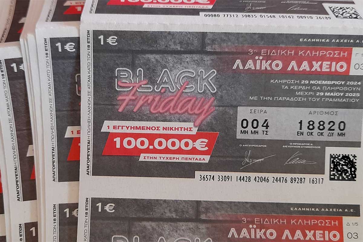 Λίγες ώρες απομένουν για την ειδική κλήρωση Black Friday του Λαϊκού Λαχείου, με το ιστορικό παιχνίδι του ΟΠΑΠ να μοιράζει εγγυημένα 100.000 ευρώ στην τυχερή πεντάδα την Παρασκευή 29 Νοεμβρίου.