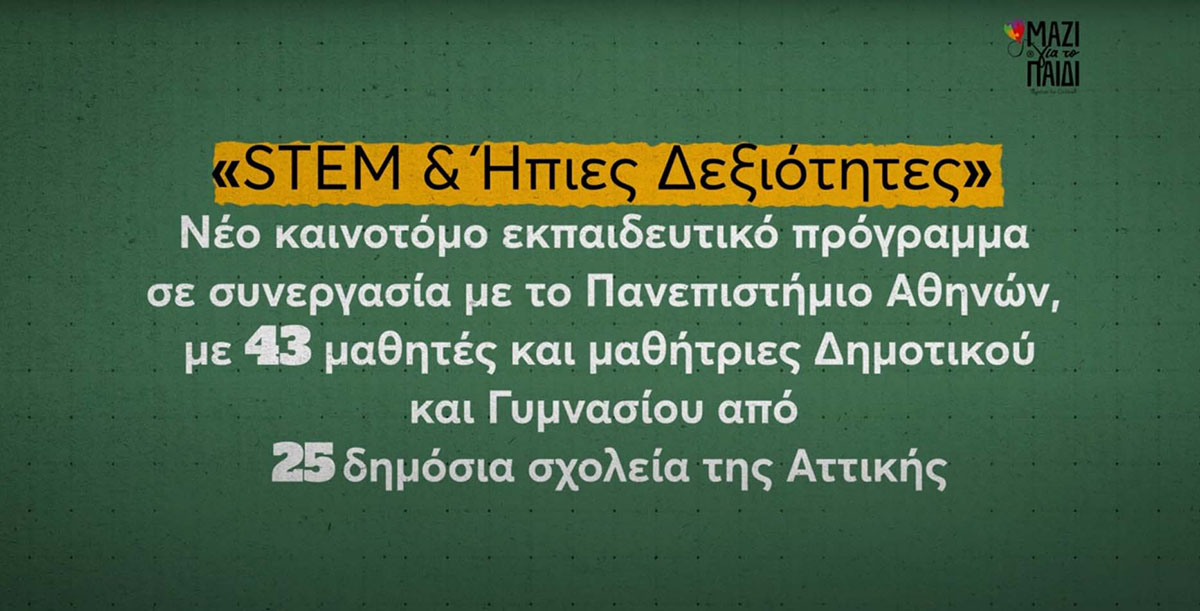 - Με ένα νέο καινοτόμο εκπαιδευτικό πρόγραμμα σε συνεργασία με το Εθνικό & Καποδιστριακό Πανεπιστήμιο Αθηνών, μαθητές και μαθήτριες Δημοτικού και Γυμνασίου από δημόσια σχολεία της Αττικής εισάγονται σε πρακτικές STEM (Επιστήμη, Τεχνολογία, Μηχανική, Μαθηματικά), καθώς και σε ψηφιακές και ήπιες δεξιότητες έχοντας την ευκαιρία να αναπτυχθούν ολόπλευρα, τόσο σε επίπεδο γνώσεων, δεξιοτήτων/ικανοτήτων όσο και στάσεων ζωής.