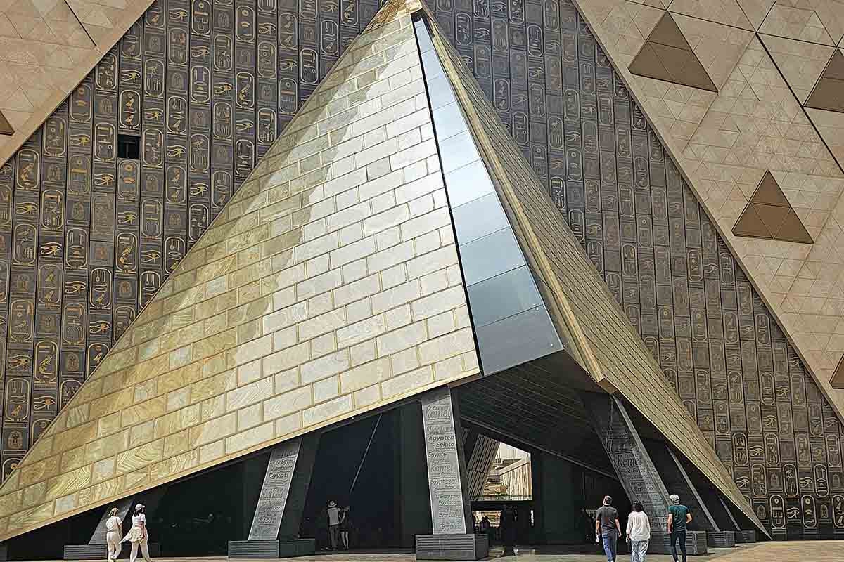 Από κοντά το εξωτερικό του μουσείου καλύπτεται από μοτίβα πυραμίδων με ζωγραφισμένα ιερογλυφικά, μία σαφή αναφορά στις πυραμίδες της Γκίζας, οι οποίες υψώνονται 1 μίλι μακριά. Το μήνυμα της αρχιτεκτονικής εταιρίας που ανέλαβε να χτίσει αυτό τον κολοσσό είναι σαφές: Αυτό είναι ένα μουσείο κατάλληλο για τους Φαραώ! Μάλιστα λέγεται ότι σε αυτό το μουσείο δούλεψαν και Ελληνες αρχιτέκτονες, ενώ την επικοινωνία του έχει αναλάβει ελληνική εταιρία. Τελικά, όποια πέτρα κι αν σηκώσεις θα δεις κι έναν Ελληνα. Το GEM είναι ένα εγχείρημα ετών της αιγυπτιακής κυβέρνησης -που καλύφθηκε σε μεγάλο βαθμό από κρατικά κονδύλια και δάνεια-, το οποίο καθυστέρησε να παραδοθεί λόγω των εξεγέρσεων της Αραβικής Ανοιξης και της πανδημίας, με αποτέλεσμα να βγει εκτός χρονοδιαγράμματος.