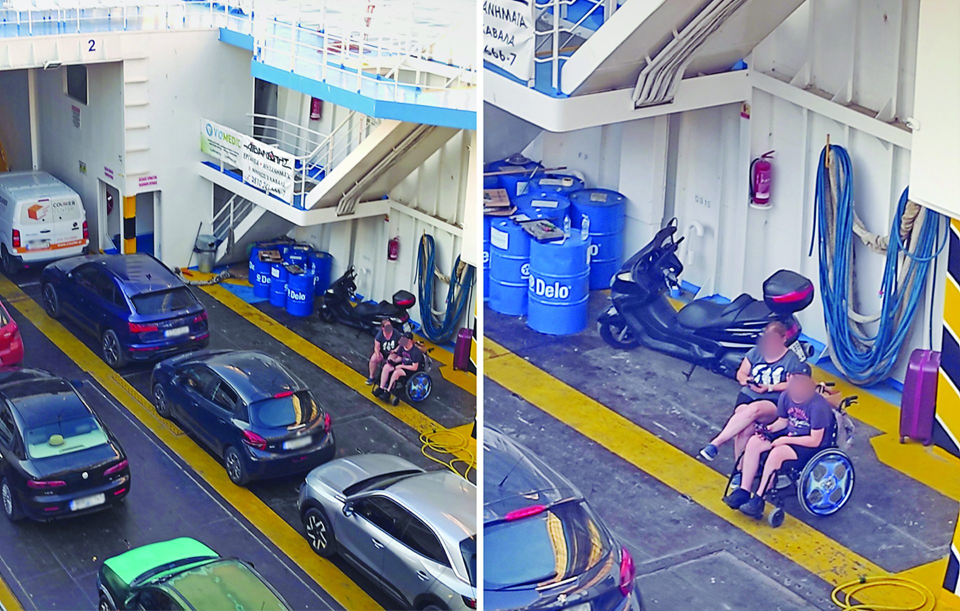 Τις εικόνες ντροπής από την απάνθρωπη μεταχείριση αποτύπωσε φωτογραφικό ντοκουμέντο που δείχνει ανάπηρο παιδί και τη συνοδό του το απόγευμα της Τρίτης στοιβαγμένους στο γκαράζ, μαζί με τα οχήματα, επί σχεδόν μία ώρα κάτω από τον καυτό ήλιο μέχρι να αποβιβαστούν στην Κεραμωτή, καθώς στο πλοίο δεν υπάρχει ειδική μπάρα για να ανέβει το αγόρι με το καροτσάκι του στο σαλόνι ή στο κατάστρωμα.