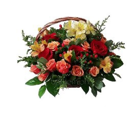 Καλάθι με λουλούδια σε κόκκινο και πορτοκαλί