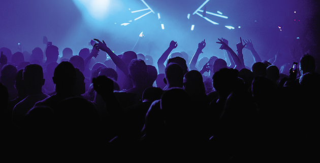 Τα δόντια και τα μάτια «αστράφτουν» υπό το φως των κρεμασμένων από το το ταβάνι φωτιστικών τύπου Black Light. Στο βάθος κυριαρχεί μια σκηνή με τον dj και μια μεγάλη οθόνη προτζέκτορα.