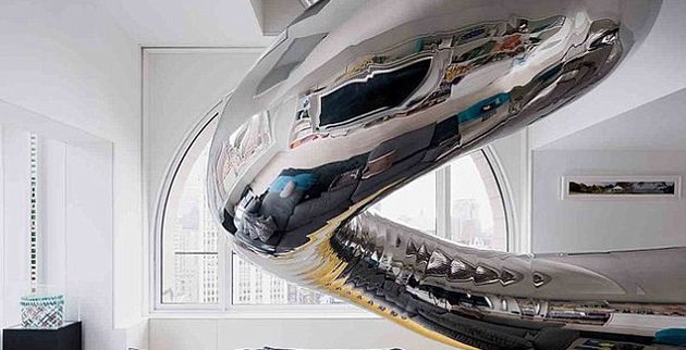 Κάπως έτσι, κρεμαστές σκάλες οδηγούν σε κρυφές σοφίτες, μία μεγάλη κούνια αιωρείται μπροστά στο τζάκι, γυάλινα πατώματα δίνουν την αίσθηση ότι οι ένοικοι περπατάνε στον αέρα, ενώ ένας ατσαλένιος στύλος ύψους δώδεκα μέτρων διαπερνάει και τα τέσσερα επίπεδα του σπιτιού, δίνοντάς τους την ευκαιρία να «γλιστράνε» από το έναν όροφο στον άλλον. Οσο για την κεντρική σκάλα, αυτή έχει δώσει τη θέση της σε μία ατελείωτη τσουλήθρα!