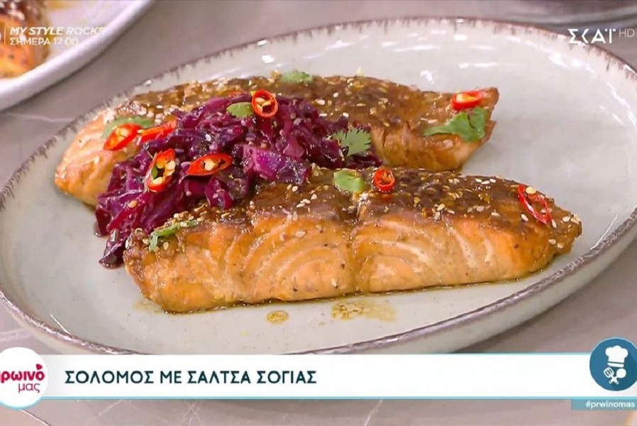 Ο Δημήτρης Σκαρμούτσος έφτιαξε σολομό με σάλτσα σόγιας στην κουζίνα της εκπομπής «Πρωινό μας». Ο σεφ έφτιαξε ένα ιδιαίτερα νόστιμο πιάτο.