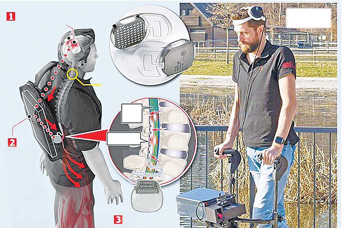 Οι παλμοί στέλνονταν ασύρματα σε ηλεκτρικό εμφύτευμα στον νωτιαίο μυελό. Εκεί με τη βοήθεια 16 ηλεκτροδίων ενεργοποιούσαν τα νεύρα που ελέγχουν την κίνηση των ποδιών, επιτρέποντας στον ασθενή να σταθεί όρθιος, να περπατήσει και να ανέβει σκάλες.